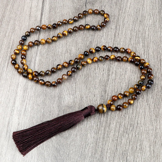 Rose quartz malas open your heart chakra and promote self-love. Tiger eye beads boost confidence and focus. Black onyx gives protection and grounding.
